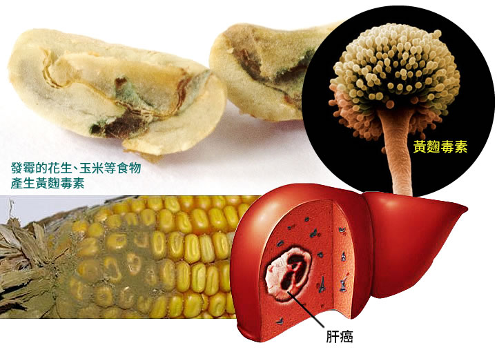 黃曲黴菌(黃麴毒素)已被證實是肝癌的致癌物之一,其強烈的毒性是砒霜68倍。常由黃曲霉及寄生麯黴等另外幾種黴菌在黴變的穀物中產生,如大米、豆類、花生等,是目前為止最強的致癌物質。任何發霉的食物絕對不能吃,沒有發霉的部份表面看不出來,但內部已經有霉菌絲了。