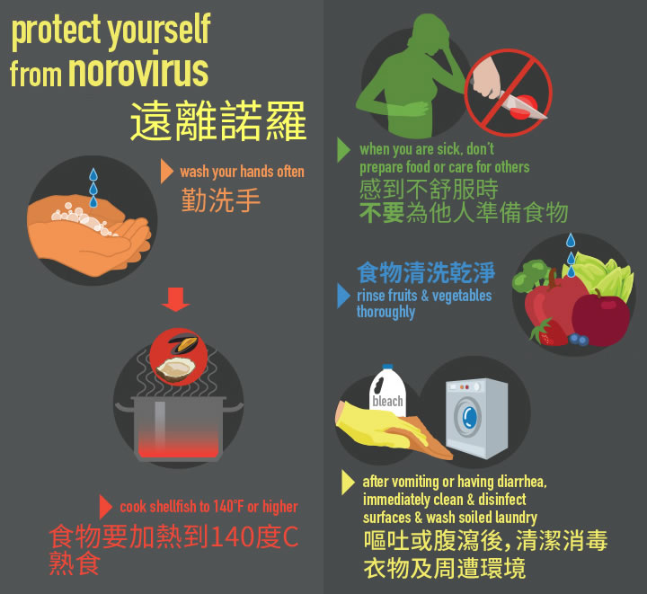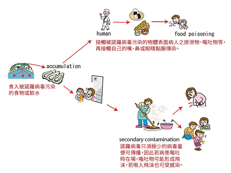 3. | 諾羅病毒只須極少的病毒量便可傳播,因此若病患嘔吐時在場,嘔吐物可能形成飛沫,若吸入飛沫也可受感染。 |