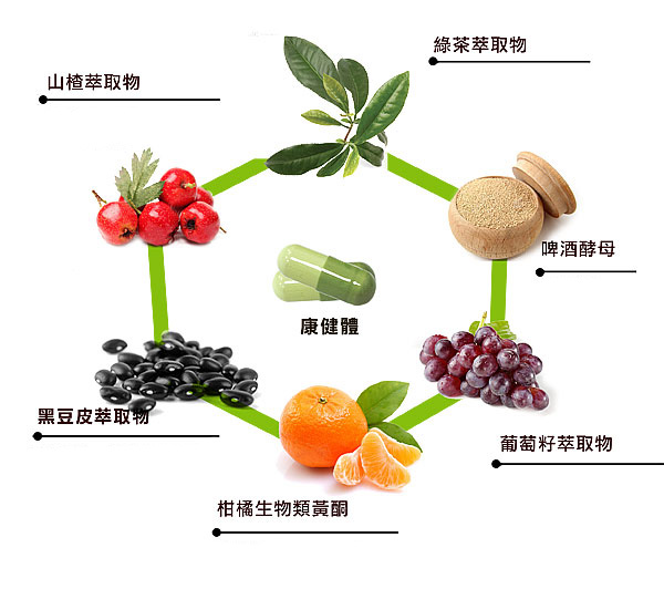 EGCG(綠茶萃取)、黑豆皮萃取物、葡萄籽萃取物、柑橘生物類黃酮、啤酒酵母、山楂萃取物